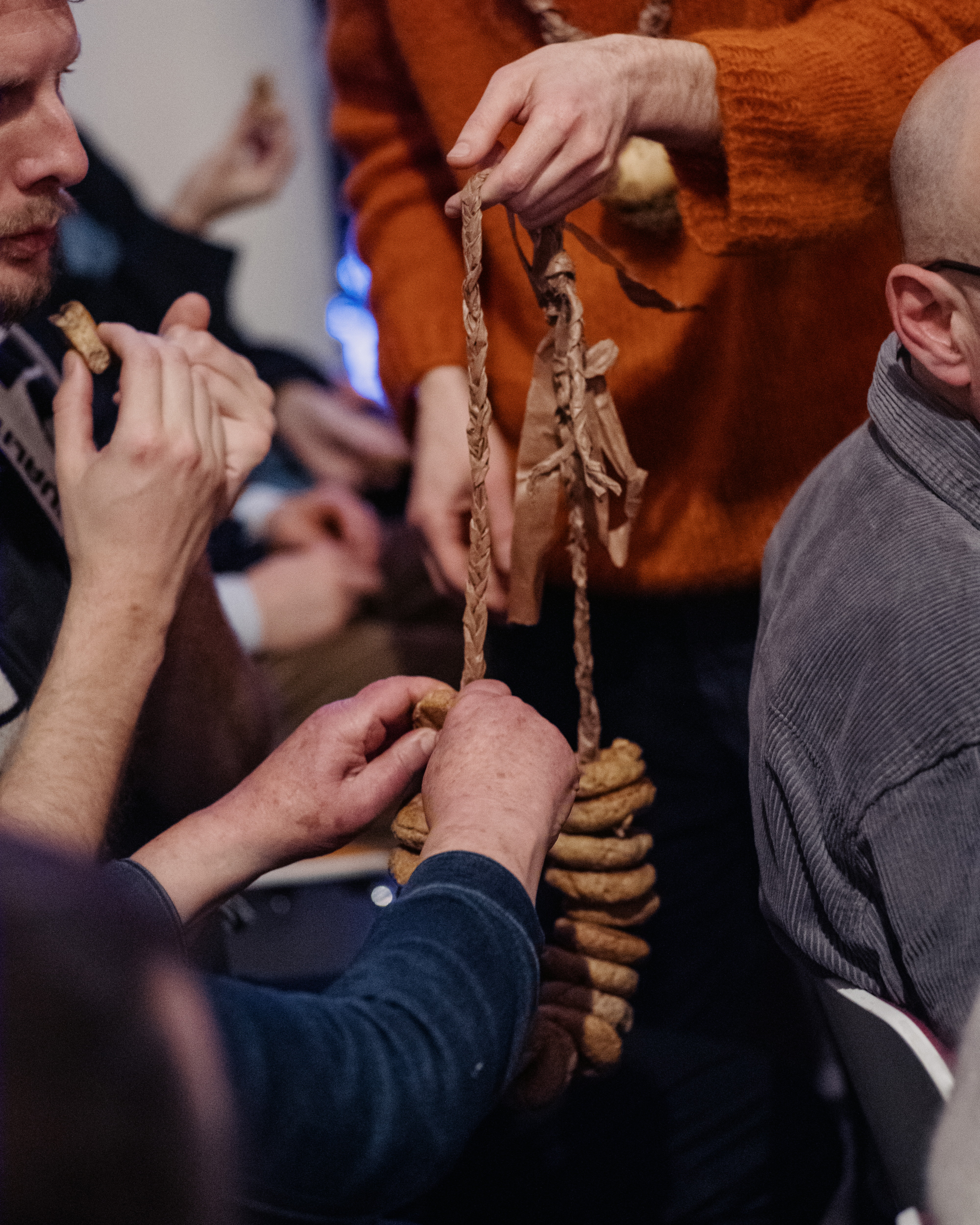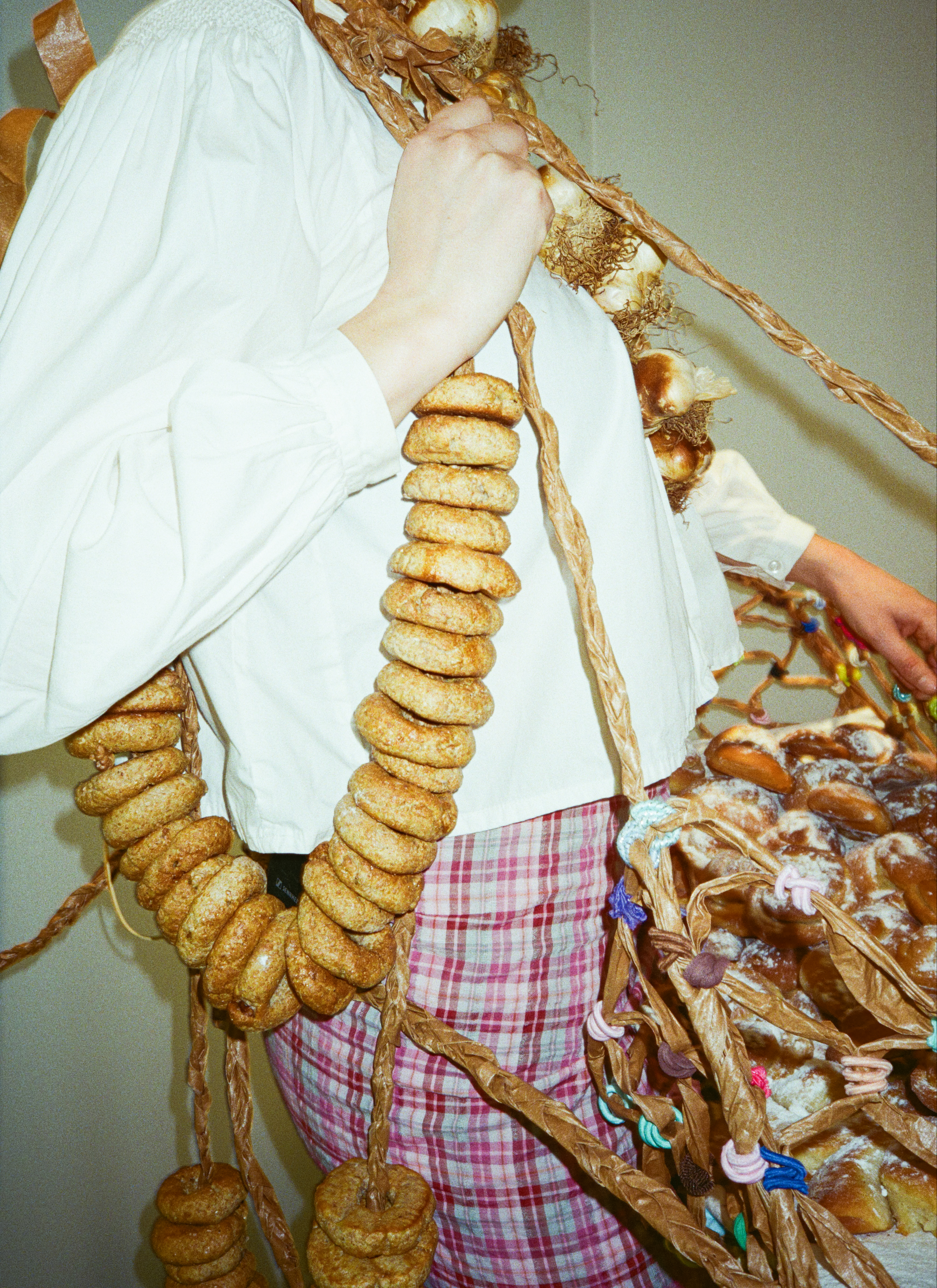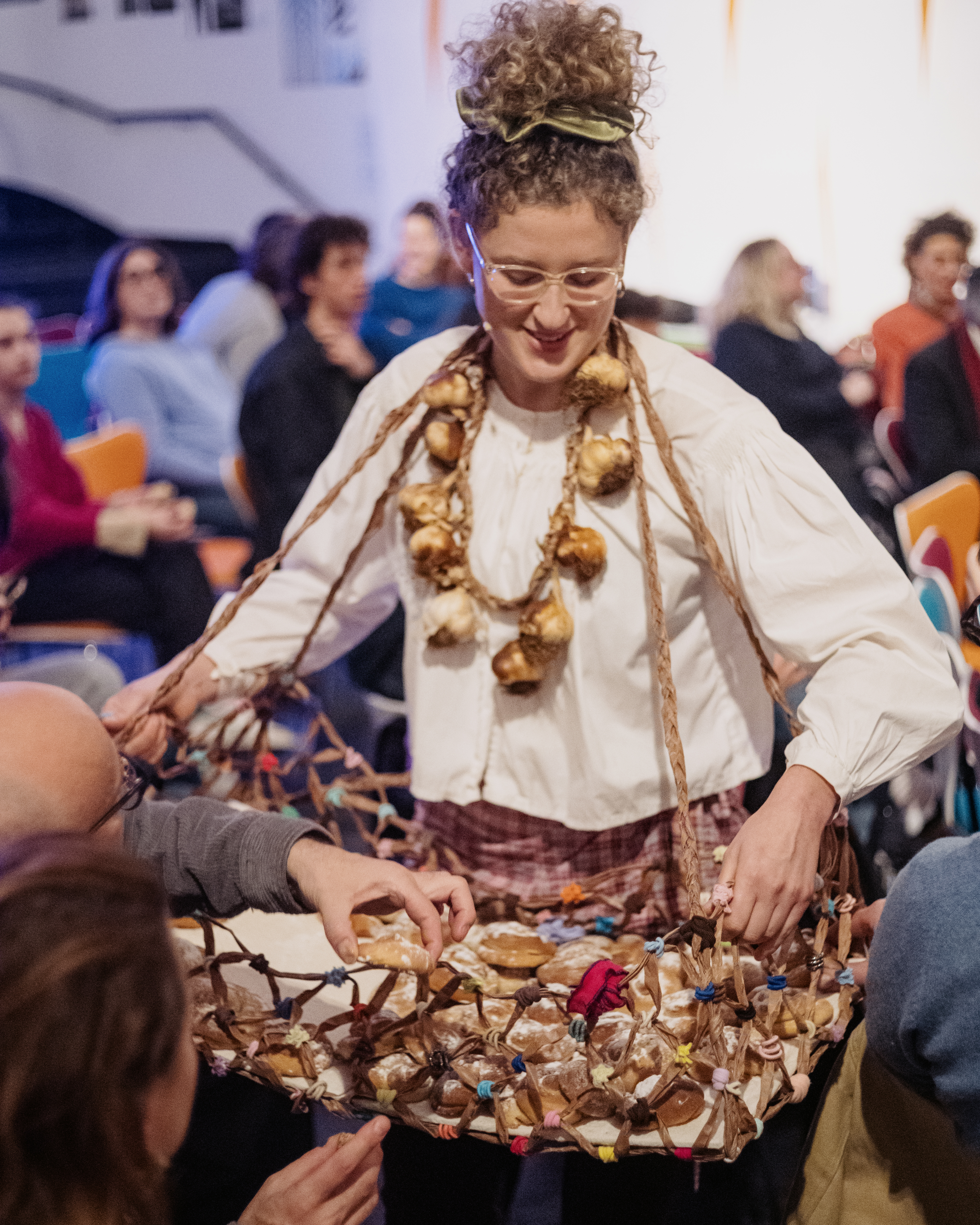 During the performance, I walked in spirals while distributing spiral-shaped ensaïmadas from Mallorca, embodying non-linear time and regeneration. The audience could break off a sushka (the smaller sister of the bagel) from the strings draped around my shoulders, symbolizing the cycle of life. Around my neck, I wore a braided garlic necklace as a protective charm. Everyone was given a clove of garlic to keep in their pocket.