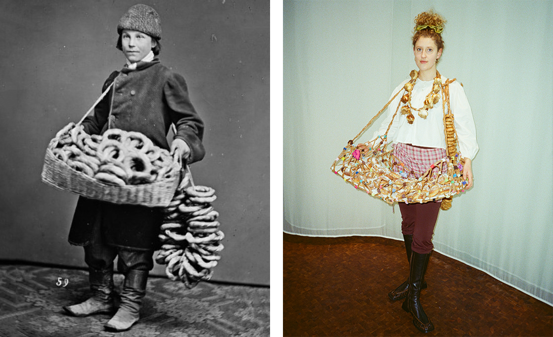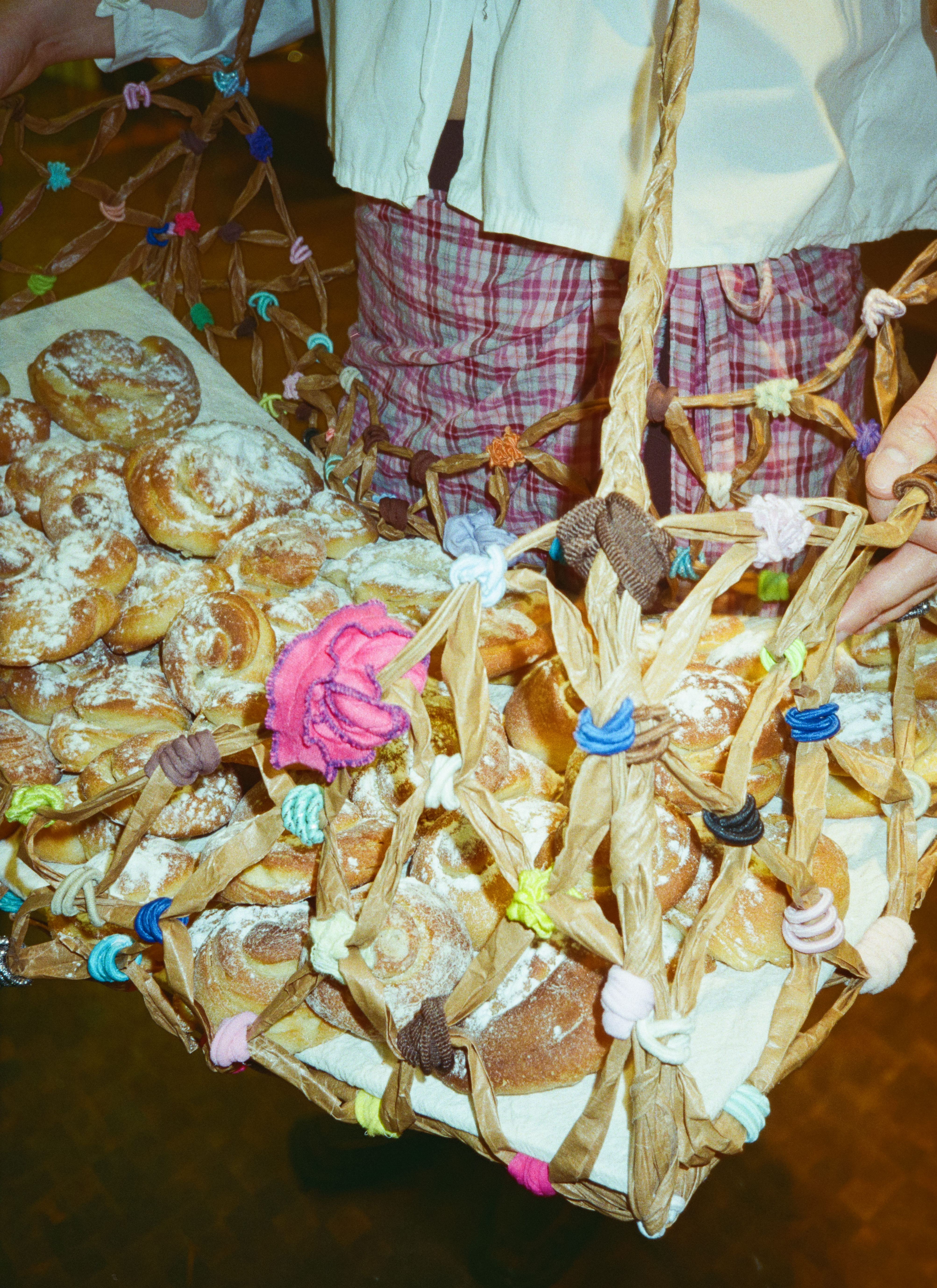I developed a vision of what Judeo-Futuristic food could be. In collaboration with Veerle Melis, we created a braided basket, inspired by early 19th-century portable market vendors in Eastern-Europe, who walked from village to village carrying baskets filled with fresh produce and strings of baked goods wrapped under their arms.